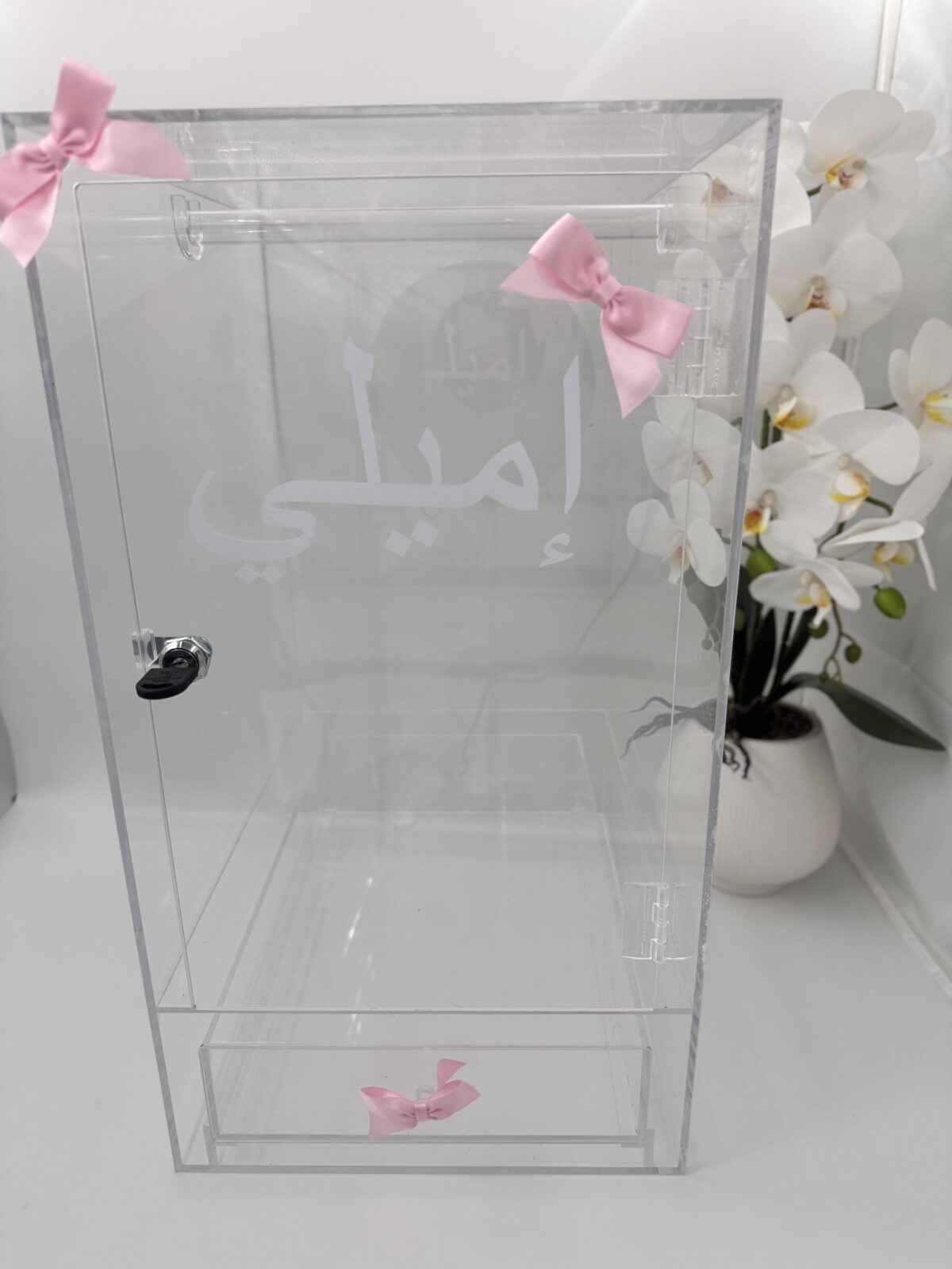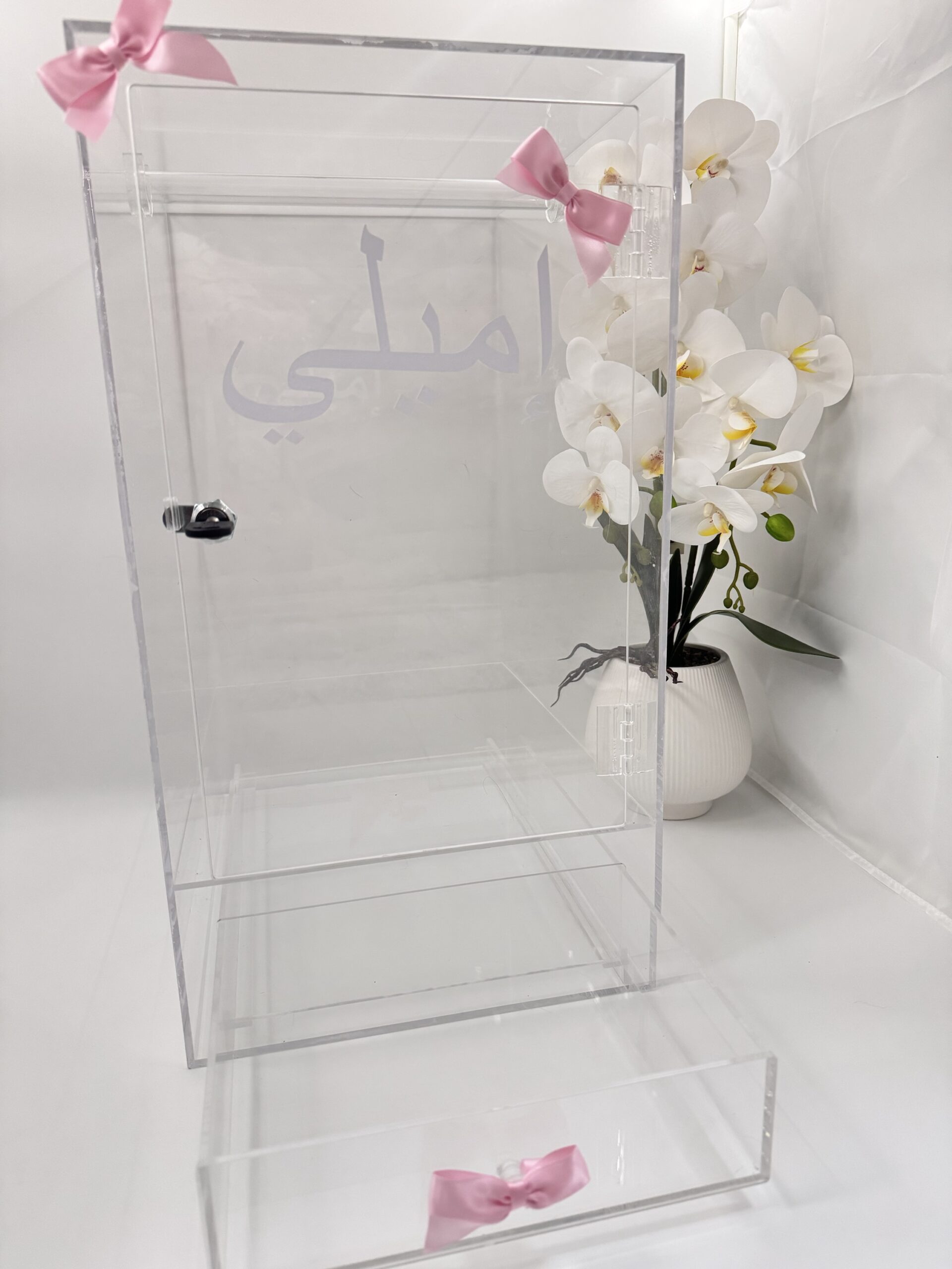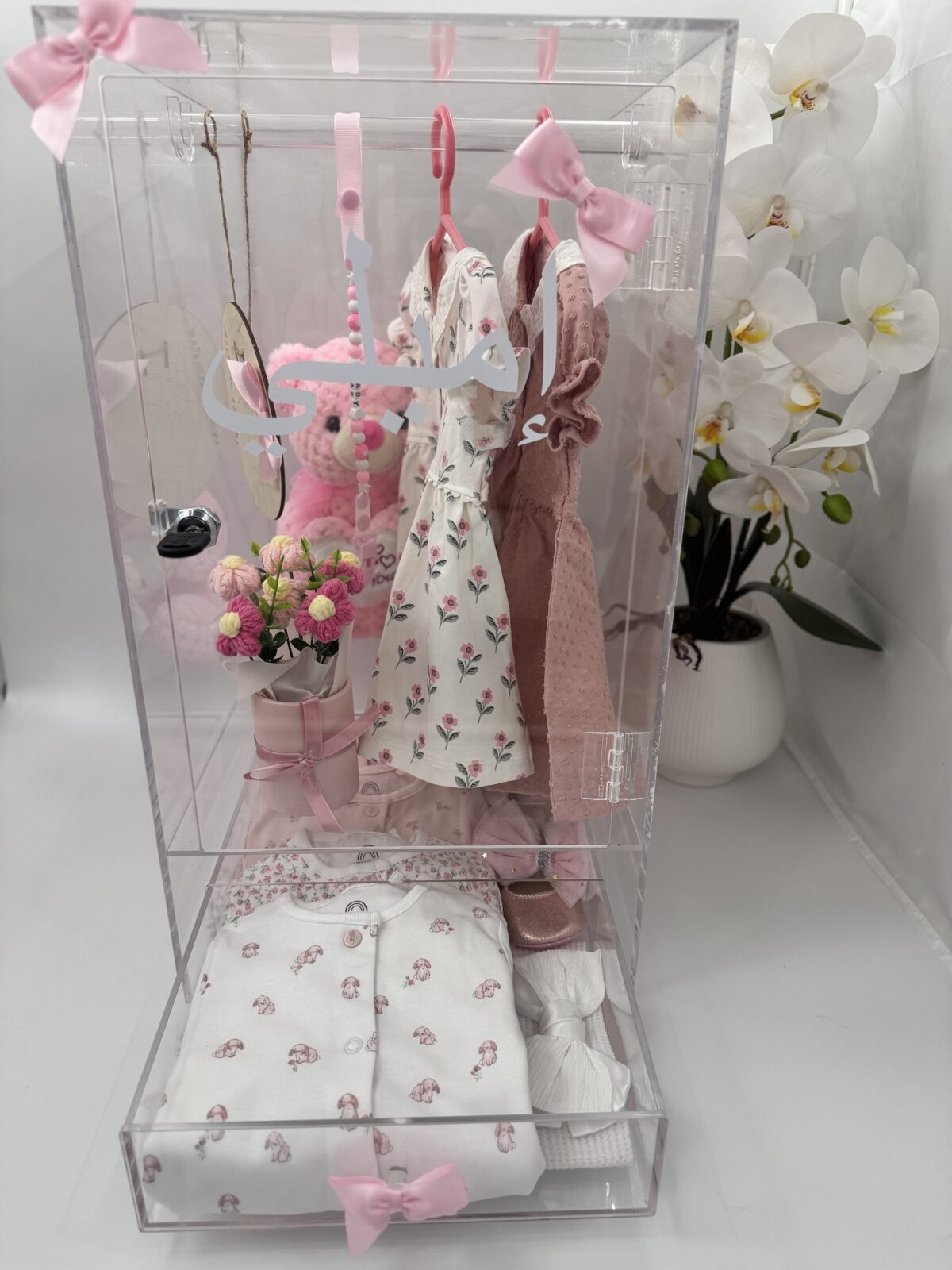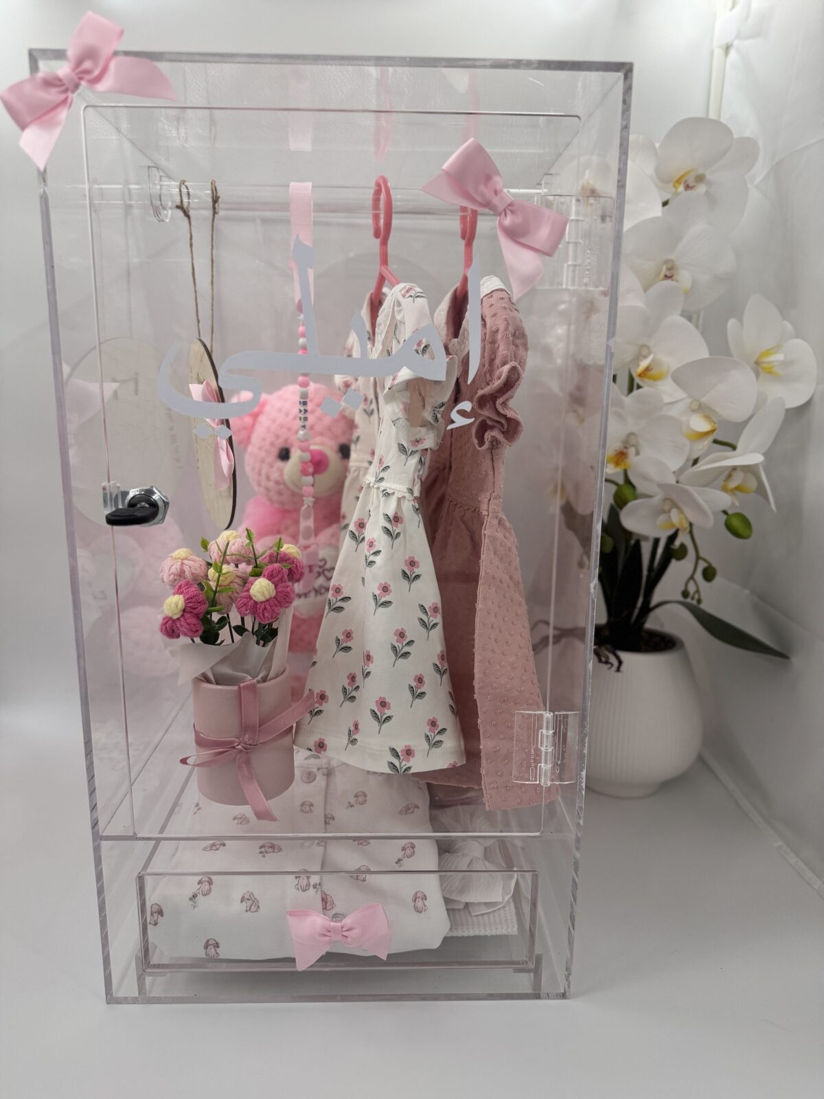 هدية فاخرة ومميزة للمولودة الجديدة، تأتي داخل خزانة أكريليك شفافة بتصميم راقٍ مزين بفيونكات وردية، مع إمكانية كتابة اسم المولودة على واجهة الخزانة لإضافة لمسة شخصية خاصة.