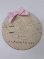 بطاقة خشبية منقوشة بعبارة ترحيبية: “يا هلا بمن لفانا الله يحفظها بعينه اللي ما تنام”.